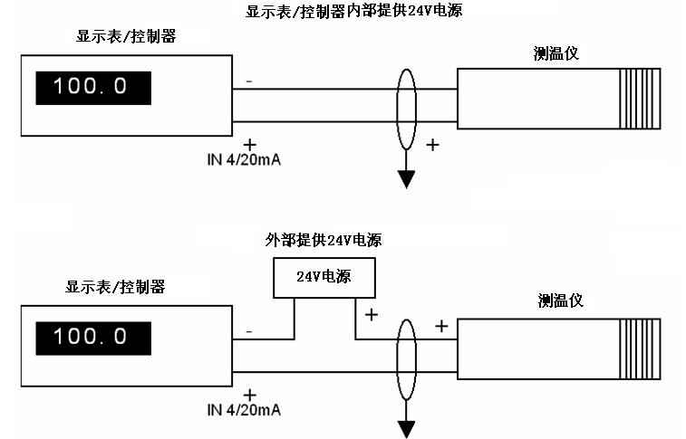 對于4~20mA的模擬信號輸出。為兩線制環(huán)路電流輸出方式,其與顯示器或控制器的連接,有以下兩種典型應用(連接法):