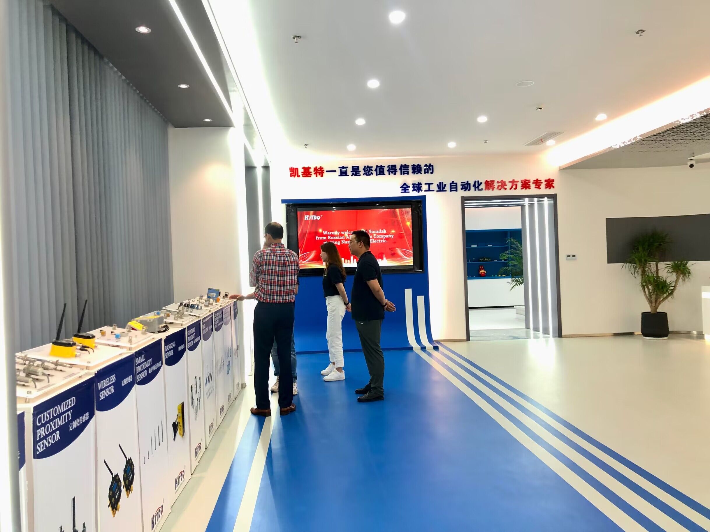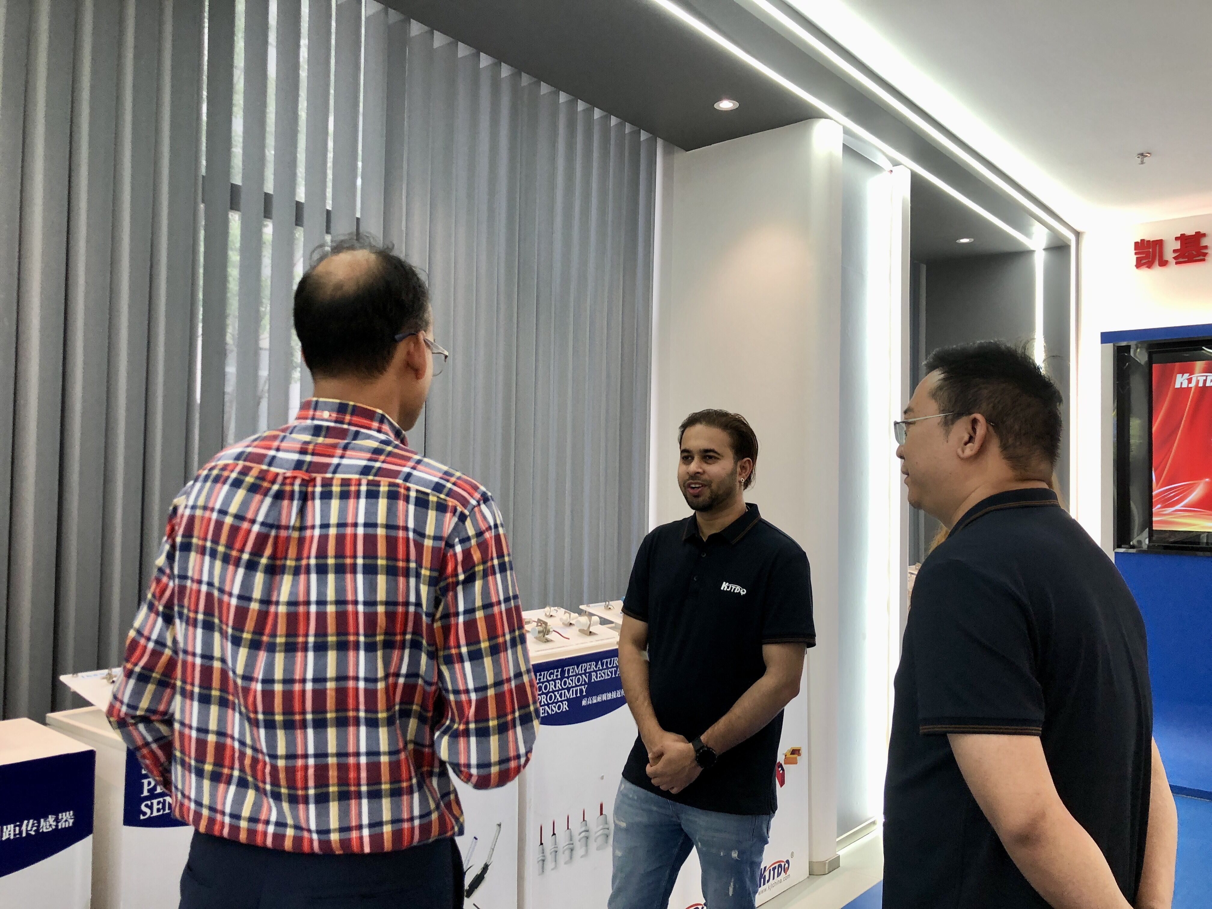 Mr.Suradzh在總經理鄭斌和外貿同事李嫄、Daniel的陪同下參觀公司展廳,由Daniel講解展廳展示的公司各類傳感器產品,客戶對產品有了更加深入的了解。